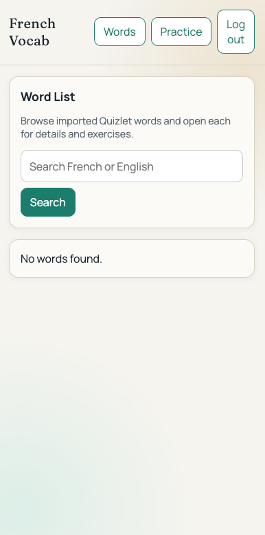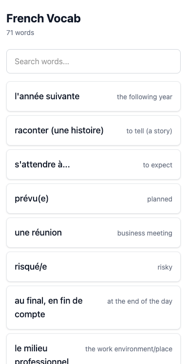 Build a full-stack TypeScript Next.js app that imports flashcard sets from Quizlet and enhances them with LLM-generated contextual enrichment and interactive exercises. The app is for a single user learning French.