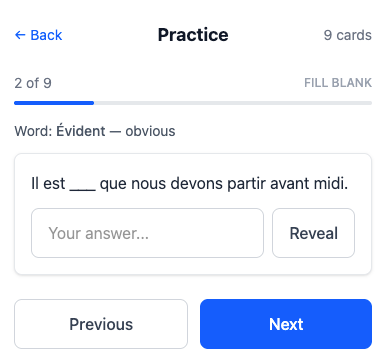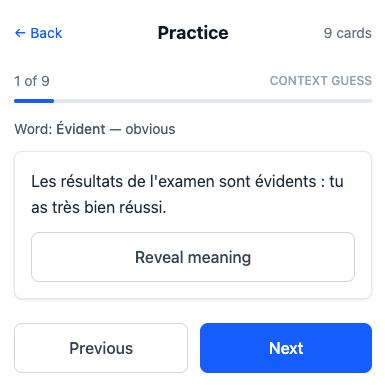 Context guessing: Show the French sentence. User thinks about the meaning. Tap to reveal the English meaning and explanation.