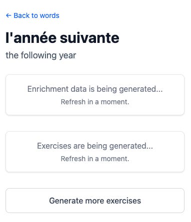 My French teacher sends me vocab flashcards via Quizlet, but it’s basically just English/French word pairs. I want an LLM to generate contextual usage in a sentence, exercises to prove my understanding, etc. Plus, I have some of my own UI idiosyncratic preferences that Quizlet doesn’t meet.
