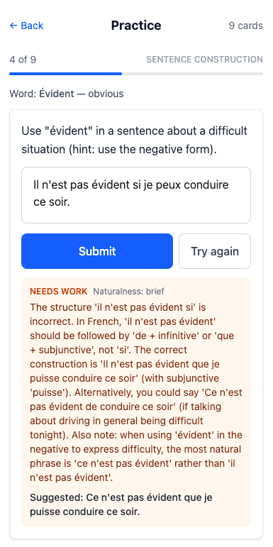 Sentence construction: Show the prompt. User types a French sentence. Submit button triggers live evaluation. Feedback displayed below. User can submit another attempt independently.